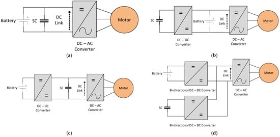 An important obstacle in HESS design involves analysing the configuration of the SC and battery with regard to the DC (Direct Current) bus. Various configurations for battery–SC interconnections have been investigated and explored, each exhibiting distinct merits and drawbacks. Several studies in the literature have strived to develop battery–SC HESSs for EVs, adopting different configurations to connect the battery and the SC [,,,]. Figure 2 depicts various configurations of HESSs []. The fully active HESS is one of the most widely used topologies, as represented in Figure 2d. A broad range of energy management strategies have been proposed and have attracted significant interest among EV communities’ societies. This setup establishes a connection between both components and the DC bus using bidirectional DC–DC converters, providing notable benefits. This configuration enables an effective energy allocation and a quick adaptation to power requirements, enhancing the overall efficiency and durability of the electric vehicle’s energy storage system. By capitalising on the high power density of supercapacitors and the high energy density of batteries, the fully active HESS optimises energy efficiency, guaranteeing dependable and consistent operation in a variety of driving scenarios.