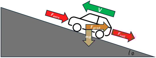 where is air density, represents the drag coefficient, represents the frontal area of the vehicle, and denotes velocity. The main cause of rolling resistance is the interaction between the road surface and the tyre. Both the friction of ball bearings and the power transmission system are factors that contribute to the rolling resistance. Rolling resistance increases in direct correlation with the mass of the vehicle. Equation (3) represents the force of horizontal road rolling resistance [].