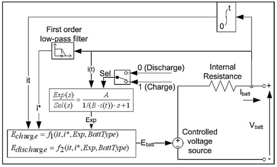 Equations (8) and (9) play a crucial role in determining the amount of energy needed for charging and discharging by taking into consideration many variables, including the actual current (), the filtered current (), the exponential smoothing factor (), and the battery type (). By including these parameters, the equations play a crucial role in enabling the battery management system to accurately regulate energy distribution, thus improving efficiency and prolonging the battery’s lifespan under different operational circumstances. The precise derivation and proper integration of these mathematical equations with the battery model’s elements are crucial for efficiently controlling energy flows, as depicted in the battery model schematic.