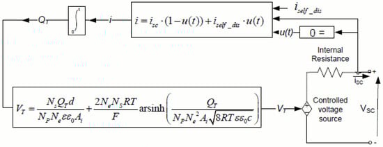 where is the short circuit current, is the self-discharge current, and is the unit step function that controls the transition between normal operation and self-discharge. This configuration offers a comprehensive examination of how a cell reacts to different operational situations, encompassing the impact of internal chemical processes and external circuit parameters on the flow of electric current.