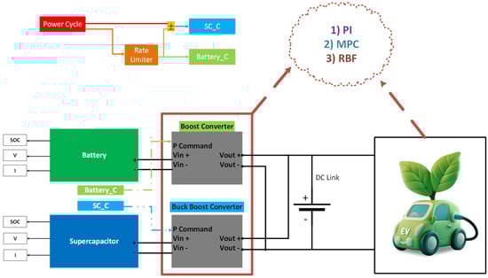 An effective controller is vital for solving the issues of optimising energy flows within an HESS to enhance the dynamic response and extend the battery life in EVs. The regulator has to carefully manage power distribution among the battery and SC to protect the battery from sudden power changes and to improve vehicle handling and passenger comfort. Figure 6 illustrates the structure of the system used in this study. This section provides an overview of the design concerns for three specific types of controllers—PI, MPC, and RBF.