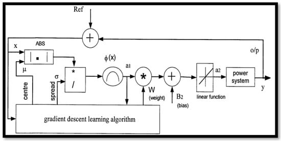 The weight (), centre (), and spread () parameters in the RBF are adjusted using the gradient descent technique. This approach improves these parameters by using the error obtained from the system’s output, as shown in Figure 7. The weight update rule is expressed in Equation (18).