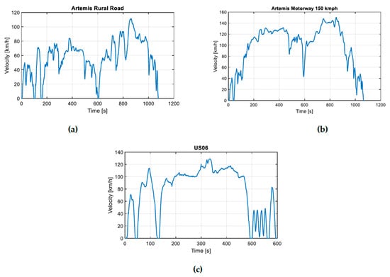 Representation of selected driving cycles: (a) Artemis rural, (b) Artemis motorway, (c) US06.