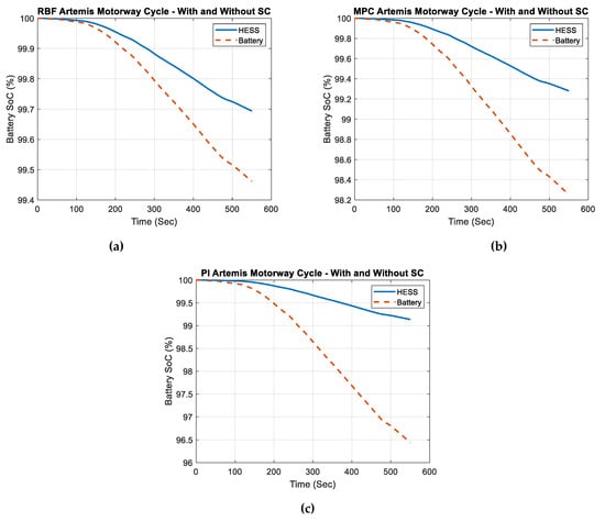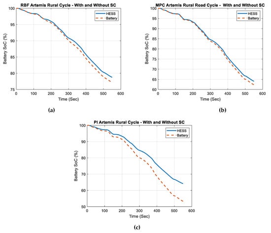 Upon analysis of the Artemis rural cycle, it can be observed from Figure 9 that the introduction of the HESS led to a very consistent battery SOC profile for all three controllers, notably PI, MPC, and RBF. The stability of the HESS demonstrates its capacity to efficiently manage the balance between energy storage and distribution, hence reducing changes in SOC that may result in losses and rapid deterioration. The enhancement can be attributed to the HESS’s capacity to utilise the high power density of SCs in managing abrupt power demands and transient loads. This decreases the strain on the battery, as it is more suitable for providing a consistent energy supply due to its higher energy density but lower power density. HESSs optimise the longevity and performance of the battery by dividing the load between the battery and supercapacitor, reducing the rate and depth of battery discharges. In addition, the HESS can effectively capture the energy from regenerative braking by utilising the SC, which can quickly charge and discharge. This process helps maintain the battery’s SOC and enhances the overall energy efficiency.