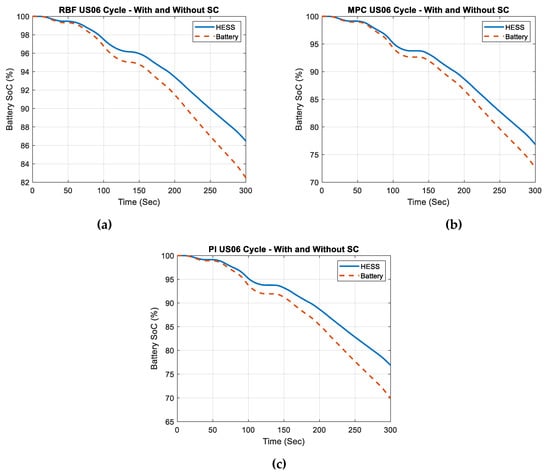 The implementation of the HESS resulted in significant advancements in the management of battery SOC throughout all driving cycles that were examined. For this study, the analysis will focus on the initial 600 s for both Artemis driving cycle scenarios and the first 300 s of the US06 cycle. This deliberate selection aims to provide a clear and easily interpretable presentation of results. The choice to give priority to the first 600 s of the Artemis driving cycle scenarios and the first 300 s of the US06 cycle was made after careful consideration. This decision has been made to capture crucial times in battery performance during dynamic and demanding driving phases. For a detailed explanation of the time setup, refer to Section 4.2.