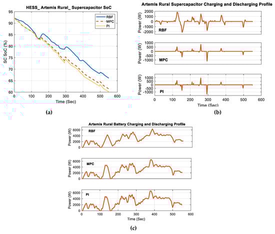 Throughout the Artemis rural driving cycle, the RBF controller regularly demonstrated superior efficiency by regularly achieving a higher SOC. The superior performance of the controller in terms of SOC improvements proved particularly apparent throughout the time intervals of 120–300 s, 380 s, and 500 s, as illustrated in Figure 12a. Furthermore, the power profiles for charging and discharging demonstrated the RBF controller’s superiority, particularly evident within the initial 200 s. The charging/discharging profiles for the three controllers demonstrate the rapid adaptability to power requirements and the effective utilisation of regenerative energy, both of which play a vital role in the acceleration and deceleration of EVs. Figure 12b provides further details on these features. Compared to the battery charging/discharging profile depicted in Figure 12c, the RBF controller demonstrates its dynamic and adaptive reaction to changing circumstances, as evidenced by its frequent and substantial fluctuations in power output. This behaviour demonstrates a control system that is very sensitive and capable of efficiently managing intricate and quickly evolving situations with accuracy. While MPC and PI controllers offer smoother responses, the RBF’s agility is advantageous in applications that prioritise flexibility and rapid modifications.