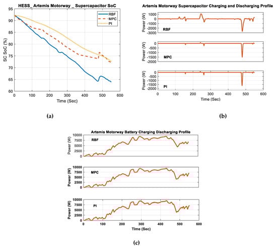 Artemis motorway: (a) SOC of SC, (b) charging/discharging profile of SC, (c) charging/discharging profile of battery.