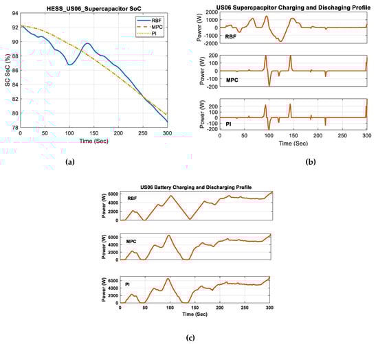 The RBF controller proved exceptional proficiency in managing the SC charge during the Artemis highway cycle study, as demonstrated in Figure 13a. Although the RBF controller initially had a lower SOC, it demonstrated significant efficiency improvements, especially obvious between the 300 s and 500 s time intervals. In contrast, the PI controller exhibited a steady decline in the SOC, as depicted in Figure 13a. The charging and discharging patterns shown in Figure 13b exhibited a strong indication of the superior performance of the RBF controller, highlighting its capacity for efficiently controlling the energy flow of the SC. Being able to maintain consistent speeds is particularly crucial in the environment of driving on motorways. The effective control of the RBF regulator assures excellent power availability and durability, thus being vital for longer high-speed journeys, even in steady-speed circumstances. Compared to the battery charging/discharging profile depicted in Figure 13c. The RBF controller demonstrates a highly steady and constant power output, maintaining a level very close to its maximum capacity during the entire time. The stability seen indicates a notable degree of accuracy and dependability in adapting to different circumstances, which is particularly important in situations that require a consistent and reliable performance. Conversely, the MPC exhibits a stable output, albeit with a bit more variability than the RBF method. This suggests that the MPC provides effective control, albeit with slightly less consistency. The PI controller, although effective, exhibits greater oscillations, indicating that it may be less appropriate for situations where power stability is of greatest significance.