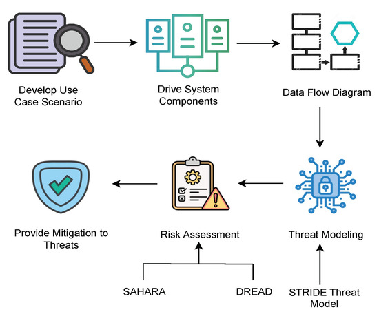 The motivation of this research is to conduct threat modeling and risk assessment and provide mitigation strategies to counter potential threats to the IVI system. This is achieved by adopting the approach sequentially at the component level, as illustrated in Figure 2.
