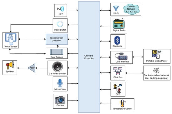 The key components of an infotainment system of an automotive vehicle with their functions and interactions are represented in Figure 4. Each component receives input and generates output to perform specific actions. The system includes an onboard computer, NFC, video buffer, touch screen controller, touch screen, rear screen, car audio system with microphone and speaker, camera, Wi-Fi and cellular network, digital radio, Bluetooth, USB interface, portable media player, CAN bus, car automation network, GPS and temperature sensor [24,25,26,27].