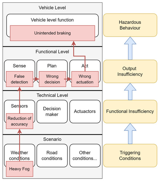 New regulations [1] require the provision of evidence from the validation process to obtain authorisation for driving on public roads and, more importantly, to avoid accidents [2,3,4,5] that occurred in the past. To obtain a better picture of safety and validation processes in the domain of autonomous vehicles, the authors [6,7] give an overview of the current situation, describing the main requirements and concepts. Standards such as UL4600 [8] also provide a list of all the required evidence to ensure the validation of a system. Other standards are being defined to explain this new safety domain in which scenarios are much more relevant. The Safety Of The Intended Functionality (SOTIF) is defined in the standard ISO21448:2022 [9] and covers the validation of hazards that are not initiated by a malfunction in the system but by misuse and technical shortcomings. The standard introduces the concept of potential triggering conditions, which are the conditions from a scenario that could cause the system to exhibit hazardous behaviour. As part of a SOTIF validation, potential triggering conditions must be covered, but the huge number of possible scenario situations makes testing all possible potential triggering conditions an unmanageable task. In order to fully understand the work described here, some concepts and terminology need to be clarified. A triggering condition is defined in [9] as a specific condition of a scenario that starts a reaction in the system contributing to hazardous behaviour. Potential could be included as a prefix when it is not yet validated, but experts see evidence that it could turn out to be a triggering condition in the end. A functional insufficiency is defined as an insufficiency of specification or performance insufficiency. The scope of the work is only focused on performance insufficiencies; therefore, the insufficiencies of specification, which are the initiators of unintentional misuse, are not considered in this publication. A performance insufficiency is defined as a limitation of technical capability contributing to hazardous behaviour when activated by one or more triggering conditions. An output insufficiency is an insufficiency on a functional level and, like the other insufficiency, can be activated by one or more functional insufficiencies or triggering conditions. Hazardous behaviour is defined as the behaviour of a system that is not within the specified acceptance criteria. The acceptance criteria could be defined on the basis of different Key Performance Indicators (KPIs) or, in the case of safety, Safety Performance Indicators (SPIs). An overview of the currently available metrics to define these criteria is given in [10]. Additionally, the authors in [11] present a survey of the current standards related to safety in the automated driving domain, including the definition of common perception failures and relevant metrics to evaluate perception systems. Other authors [12] also give an overview of the current standards but focus on SOTIF. This research work shows the relationship between SOTIF and other standards as well as its implementation in the verification and validation process. Another safety standards overview is provided in [13] with a focus on object-based environment perception. The relationship between these concepts is shown in Figure 1, which illustrates how a triggering condition may start in a potential triggering condition (heavy fog) and lead to hazardous behaviour (unintended braking). Another example could occur if a vehicle leaves a tunnel. If an ADS only relies on a camera as a perception sensor, this camera has some moments with extremely high-contrast images that may impact the behaviour of the ADS. In an attempt to cover the topic of triggering conditions, the authors in [14] present a systematisation and identification of triggering conditions, providing a categorisation to better handle them, which also gives us a better understanding of the concept in this context. This topic was also covered in our previous work [15], where the process of testing the triggering conditions was explained, but the realisation of the impossibility of covering all triggering conditions made us change the direction of our research to validate an ADS by using perception performance insufficiencies instead.