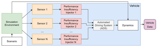 The perception component of an ADS includes different sensors and technologies that can vary the perceived reality. In our approach, performance insufficiencies are given at a high level of abstraction. Therefore, when a performance insufficiency is injected, it is related to the raw data that the sensor provides as input to the system. For example, if a lidar performance insufficiency is implemented, it uses point cloud messages for the injection, or image frames if a camera is used. The architecture of the approach is shown in Figure 4, which shows that the injection is added to the raw data of the sensor before it is included in the ADS system. Although in our approach only perception performance insufficiencies are considered, the effect of the injection could appear in any block of the ADS of Figure 3: sense, decision and actuation.