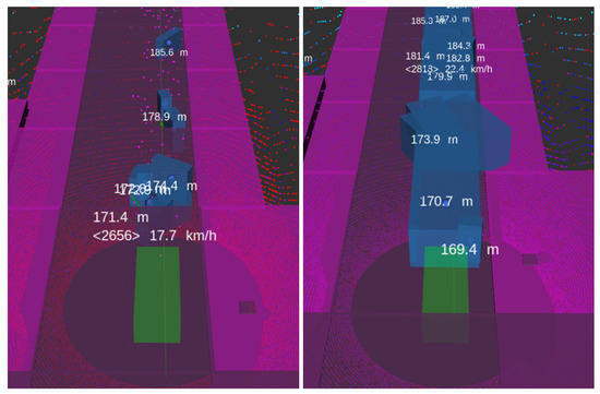 Figure 11 shows two levels of injection from the vehicle perspective. The left picture shows level 2 of injection, where we observe the false negatives produced by the random reflections in the point cloud message. The right picture shows a higher level of injection, where the amount of false detections makes the ego vehicle stop completely. The impact of each injection level is shown in Figure 12. Levels 0 and 1 do not have any relevant impact on the outcome of the function, but from level 3, the impact of the outcome is remarkable. Level 2 makes the ADS still follow the path but with successive stops due to the false negatives, while at levels 3 and 4, the ego vehicle remains stopped. Noteworthy is level 5, where the huge amount of reflections causes the target vehicle not to be considered as an object, eventually leading to a collision. Unlike the previous use case, in this case, hazardous behaviour does not always generate a collision, as Table 6 depicts.