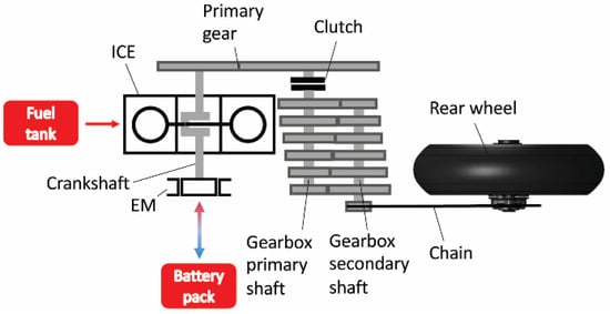 10] might be worth investigating for a possible increase in the powertrain efficiency while limiting the modifications to the motorbike layout and containing the added mass. The minimum devices to be added are the electric motor, battery pack (including the cells, fuses, switches, and Battery Management System), motor controller (inverter), and a possible cooling system. Consequently, the benefits must be significant enough to justify the increased component costs and system complexity of implementing this solution in real-world scenarios.