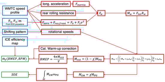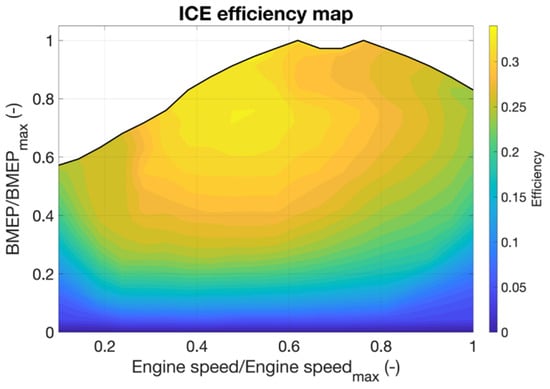 The third bullet point refers, for example, to the starter motor removal or to the possible electrification of the water and/or oil pumps. These modifications are more related to mass and cost reduction, and their direct contribution to fuel consumption reduction is estimated to be limited compared to the other two. Therefore, this study is mainly focused on the estimation of the influence of kinetic energy recovery and on the shifting of the ICE operating point. Another important consideration to be made is the impact of losses in the electrical components. In fact, while these losses can be neglected in the preliminary design and sizing of the system, an analysis of their impact cannot be completely disregarded when analyzing the feasibility and convenience of the adoption of this technology. Moreover, this sensitivity analysis is also useful for setting an efficiency target for the design of electric components.