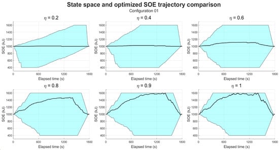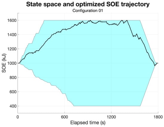 Figure 7). This is obtained by considering the electric power limits starting from the initial SOE. Therefore, the maximum increase and decrease in SOE for every timestep depends on the instantaneous operating envelope of the EM and the upper and lower SOE limitations, as described in the “Constraints” subsection.