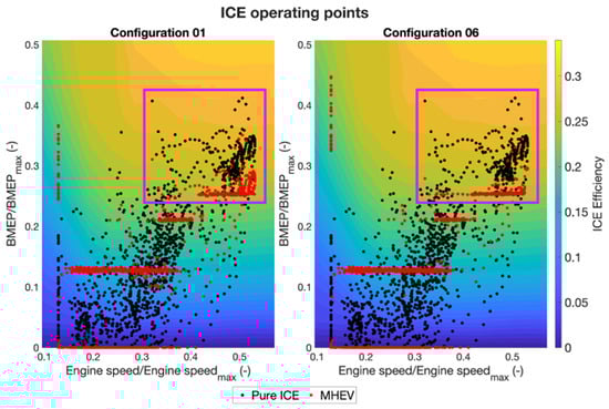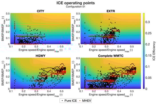 Figure 9, the operating points of the ICE are shown for both the pure ICE (in black) and MHEV configurations (in red). Configuration 01 has been chosen as an example. For the sake of clarity, the results are subdivided into the three phases of the cycle, but a complete cycle chart is also shown. In the CITY phase, most of the operating points are condensed to a single BMEP level. In this phase, the ICE is operating at a higher load than required by the road load. A specific level is selected by the algorithm considering the EM operating envelope and represents the most efficient reachable operating point for the given engine speed and deliverable torque.