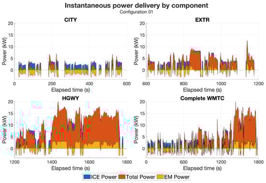 Figure 10 shows the instantaneous power delivery from the ICE and EM compared to the instantaneous total power delivery. It is possible to clearly identify the previously discussed trends in harvesting energy in the CITY phase and using it in the HGWY phase. In fact, looking at the instantaneous EM power, it is mostly negative in the CITY phase and mostly positive in the HGWY phase.