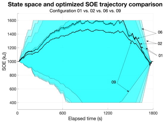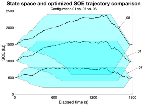 Figure 13) for each configuration represents the storable energy within the accumulator. A larger area is correlated with a higher capacity for both charging and discharging the battery. This increased capacity enhances the potential for energy storage and utilization efficiency. The lowest capacity configuration (07) appears to be heavily limited in these terms. In this case, the optimized SOE path (black curve in
