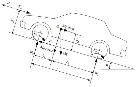 In the Equation (2), represents the mass of the vehicle, is the longitudinal acceleration, is the net longitudinal force generated by the tires, is the aerodynamic drag, is the acceleration due to gravity, and is the incline angle. The total longitudinal force is the sum of the longitudinal forces at the front and rear tires.