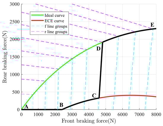 where corresponds to the intersection between the ECE curve and horizontal axis. The point is the result of the intersection between the line representing the ECE curve and the lines representing the values of at = 0.6. The point of intersection between the lines at = 0.6 and the I curve is denoted as . The black line in Figure 4 represents the anticipated locus of the distribution of braking forces with an increasing braking strength.