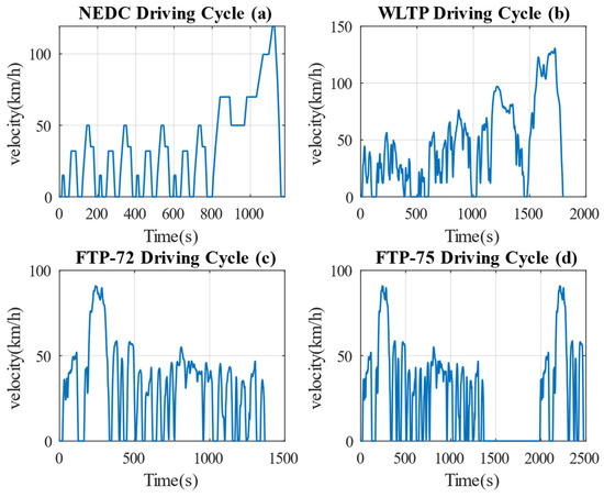 We constructed the model using the MATLAB/Simulink framework. The simulation model is composed of a MATLAB program that identifies vehicle parameters, plots them, and displays the results. The primary goal is to compare the application of a regenerative braking system with its absence. We dedicate ourselves to testing braking conditions, verifying various factors like braking forces, motor torque, wheel speed, and energy recovery, under four driving cycles: NEDC (New European Driving Cycle), WLTC (World Light Duty Vehicle Test Cycle), FTP72 (Federal Test Procedure 72), and FTP75 (Federal Test Procedure 75), as illustrated in Figure 6 [26]. The initial state of charge (SOC) of the vehicle power battery was set to 0.5.