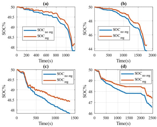 SOC variation: (a) NEDC; (b) WLTP; (c) FTP72; (d) FTP75.