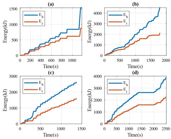 Variation in total braking energy and overall energy recovery: (a) NEDC; (b) WLTP; (c) FTP72; (d) FTP75.