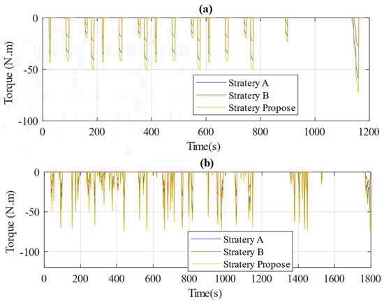 Comparison of three control strategies for motor braking torque: (a) NEDC; (b) WLTP.