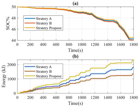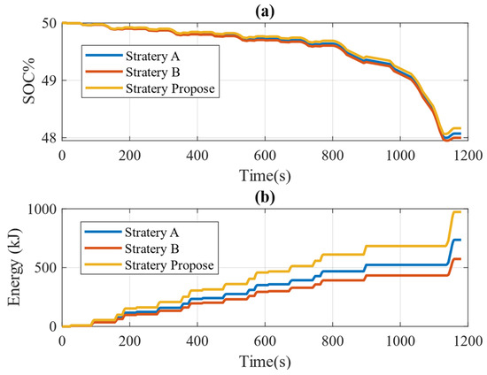 Figure 10a illustrates the initial SOC values and the values at the end of the simulation for three different control strategies in the NEDC cycle, all starting at 50%. By the end of the simulation, the SOC values are recorded as 48.16%, 48.07%, and 47.99% for the proposed strategy and control strategies A and B, respectively. The proposed strategy has the highest end SOC value at 48.16%, indicating the most effective energy recovery and utilization in NEDC conditions. Control strategy A has an end SOC of 48.07%, slightly lower than the proposed strategy but still demonstrating good performance. Control strategy B has the lowest end SOC at 47.99%, showing the least effective energy recovery among the three strategies.