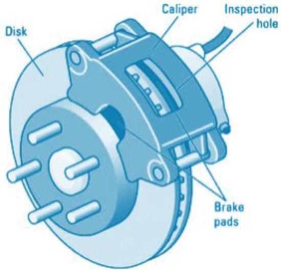 The effectiveness of disc brakes, a critical safety component in vehicles, is influenced by a multitude of factors, including the design, material characteristics, and operating conditions [37,38]. A scheme of the brake system is shown in Figure 2. The developed brake thermal model considers four factors that impact temperature, like the heat generation through friction, the brake’s convection heating or cooling with the surrounding air, the radiation emitted from the wheel affecting the brake temperature, and the heat transfer through conduction between the brake and the wheel.