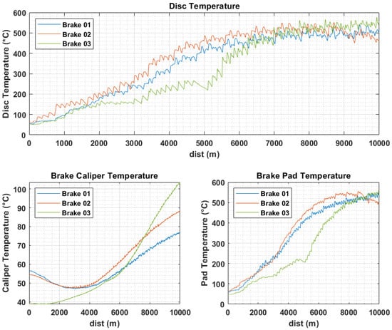 Acquired temperatures of the disc, brake pad, and brake caliper.