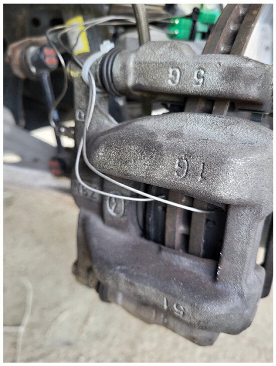 The experimental tests were conducted with the aim to calibrate the brake systems correctly in the thermal model and the heat transfer between brakes and tires. This method was selected to guarantee that the calibration aligns the internal surfaces and internal air temperatures of the proposed models with the actual temperatures measured by the sensors throughout all stages of operation. The main goal was to achieve a good level of agreement between our modeled predictions and the experimental data collected by the sensors used to acquire the brake temperature and set it in the brake system as can be seen in Figure 4.