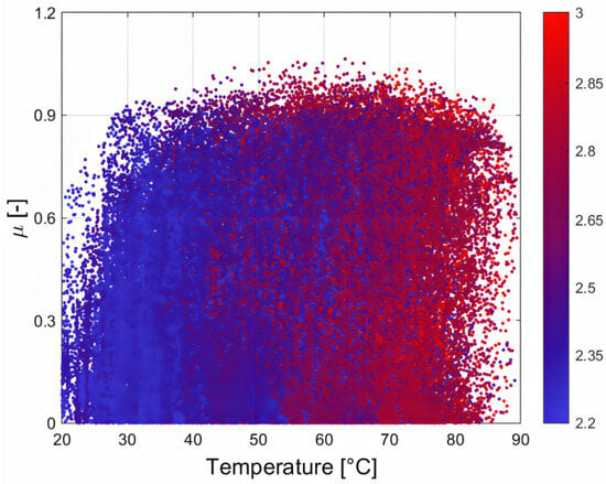 Equation (2) includes the following variables in order to evaluate the brake torque: representing the brake pressure measured with the sensor, denoting the coefficient of friction of the brakes, indicating the sum of the piston area of both the inboard and outboard sides of a single front caliper, and , which is the effective radius of the brake discs. The brake friction power, shown in Equation (1), is distributed between the brake disc and the pad through the following heat partition coefficient: