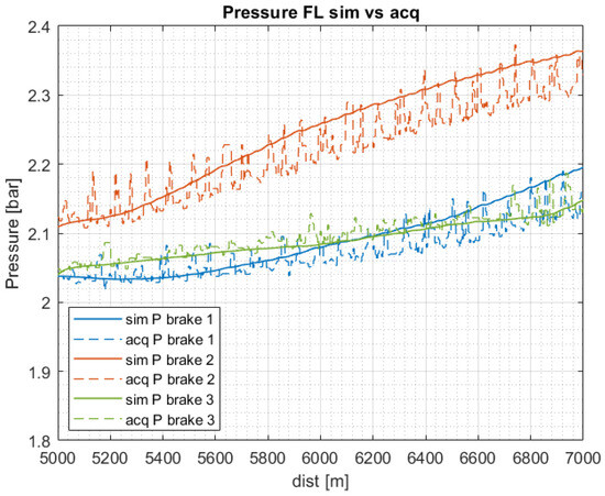 Figure 8 presents the comparison between the simulated internal air pressure (solid lines) and the acquisition values (dashed lines) for each braking system considered in a specific circuit sector of relevant importance. Obviously, the experimental model includes significantly higher frequencies of updates compared to the simulated model, which follows a smoother trajectory. As highlighted in the figure, the first two brake systems show a different behavior with respect to the other one in the final phase. The first reason for this behavior may lie in the different dimensions of the braking systems. It is also possible to observe that not all simulated curves are exactly positioned around the average value of the data purchases throughout the time history. In fact, you can see how the curve that resembles the second braking system in some sections is almost taken out of the acquired one.This is due to the fact that there was a need to find a trade-off for all simulations, as the tested tire was unique and, consequently, the parameters describing its thermodynamic behavior had to remain constant for each simulation. It is evident that these systems present a different pressure increase due to the diverse configurations. Furthermore, the first system reaches higher values since its initial condition is different from the others. This can be explained by the fact that the external environmental conditions were different.