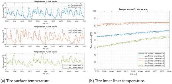 Figure 9a,b show the comparison between the simulated and the acquired temperatures of tire surface and inner liner. It can be seen that the simulated data tend toward the experimental ones. The results obtained are in agreement with the previous ones, as the inner liner temperature of the second system is higher than the others, as is also noted for the pressure. This is a fundamental aspect due to the fact that these two measures are strictly connected.