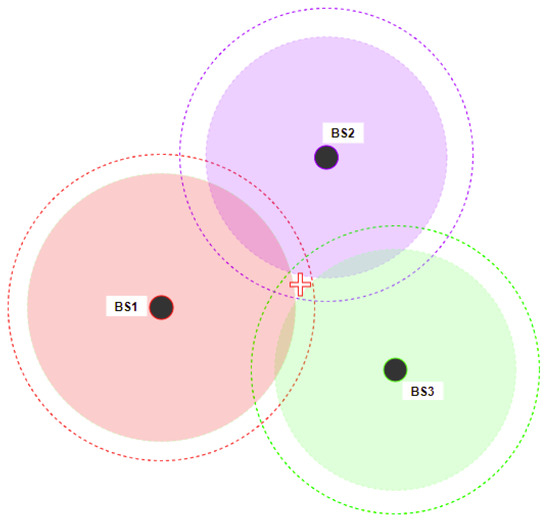 Figure 1. TOA-based positioning. - Angle-based: Angle-based positioning involves measuring the angle at which signals arrive at the receiver from multiple transmitters. This method can provide high positioning accuracy. However, it often requires more complex and expensive hardware setups compared to signal-strength-based methods, and its accuracy can be significantly affected by multipath reflections and obstructions.