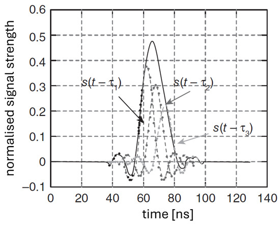 Techniques based on TOA are the most impacted by this phenomenon, as they rely on signal propagation distance to determine the user’s location. In fact, when employing time-based positioning methods, the overlap of MPCs at the receiver is a significant source of error, especially when the time delay of the MPCs is shorter than the inverse of the signal bandwidth. This is illustrated in Figure 2, which shows the arrival of two more MPCs with a delay less than the length of the signal pulse.