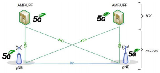 The 3GPP Release 15 announced two deployment phases for the 5G cellular network in 3GPP TR 21.915 [21]. The initial phase of 5G deployment is the so-called NSA architecture illustrated in Figure 3, which combines the 5G radio access network (RAN) and its NR interfaces with the existing LTE and evolved packet core (EPC) infrastructure to provide 5G NR without the need for network replacement to support air mobility [22]. The second phase corresponds to the deployment of the full 5G SA architecture illustrated in Figure 4. Frequency bands for 5G NR are divided into two categories, namely, FR1 and FR2, respectively, termed the sub-6 GHz and mm-Wave bands [23]: