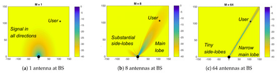 - MIMO and beamforming: MIMO antenna systems are known for achieving high spectral efficiency in wireless communication systems. This is achieved by performing parallel transmissions and increasing the number of antennas at the BS to increase the directivity of the transmitted signal. This reduces the effect of having substantial side lobes, as illustrated in Figure 5, which leads to higher spectral efficiency.