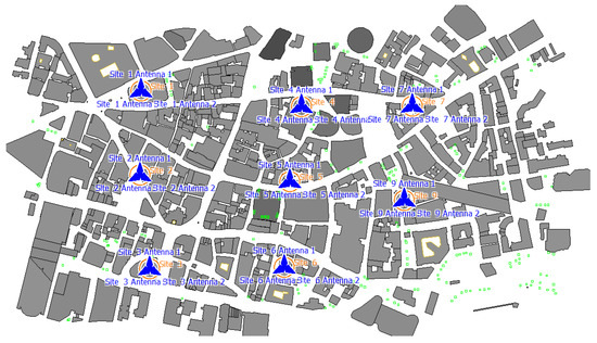 The portion of the city of London illustrated in Figure 7 was chosen due to its high average building height of approximately m. The urban scenario was converted to a series of 3D building vectors, with each building described as a vertical cylinder with polygonal ground planes. Figure 8 shows the 3D profile of the urban scenario. Table 2 and Figure 9 further show the BS station configuration and other relevant parameters related to the antenna configuration. A three-sector configuration was chosen for the BSs with a spacing orientation of 120° between sectors.
