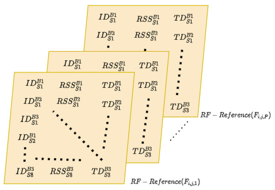 where is the cell identification of the j-th next generation node (gNB), and are the received signal strength and time delay of the signal, respectively, M is the number of location samples, and N represents the number of anchors within the range of the reference location. This process involves gathering measurable parameters of the signal which are correlated with the the sample location to ensure the uniqueness of each RF fingerprint.