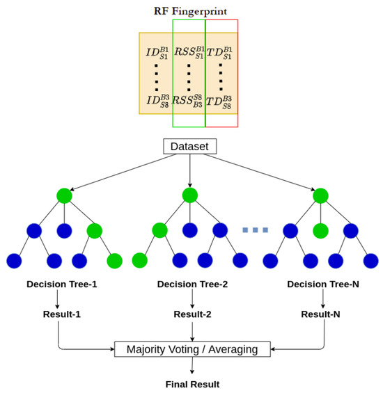 The authors in [13,14] illustrated the application of a machine learning (ML) classification algorithm based on random forest (RF) for addressing localisation challenges involving “noncollaborative” emitters in an outdoor environment, where the sensors lack prior knowledge of the signal. This technology merges the multipath fingerprint technique with ray-tracing (RT) simulations. The benefit of this approach is the ability to extract multipath fingerprints directly from received signals, bypassing the need for channel impulse response estimation.