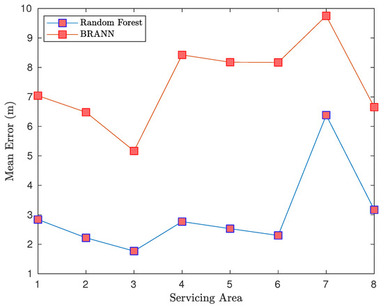 In recent years, the progress of AI has fuelled a movement towards improving outdoor and indoor localisation using AI and ML. Numerous studies introduce ML models such as support vector machines [32], decision trees [33], random forests, and NNs [34] to solve localisation and positioning [13] problems. Notably, Ref. [11] combined decision tree regression and a two-layer deep NN (DNN) to achieve a mean positioning error of 1.4 m. Due to multipath effects, however, signal strength estimates for a specific location suffer from a significant degree of fluctuation over time. Consequently, Ref. [35] suggested that channel state information (CSI) measurements provide a much better understanding of the multipath profile.