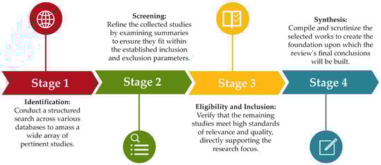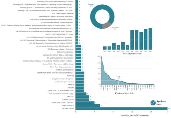 This review adheres to the PRISMA (Preferred Reporting Items for Systematic Reviews and Meta-Analyses) 2020 guidelines [32], which ensures a rigorous and transparent approach to conducting and reporting systematic reviews. The primary objective of this review is to address critical gaps in the existing literature, including the lack of holistic optimization frameworks that simultaneously integrate ESS and EVs, the limited application of adaptive and predictive control strategies to manage dynamic energy flows, the insufficient focus on interoperability challenges among DERs, and the scarcity of long-term economic and environmental analyses for large-scale ESS and EV integration. The process begins with the Identification phase, where relevant studies are systematically searched for in multiple databases, followed by the Screening phase, where abstracts and titles are reviewed to eliminate studies that do not meet the inclusion criteria. Next, the Eligibility phase involves a more detailed evaluation of the full texts to ensure that only high-quality and pertinent studies are selected. Finally, the Synthesis phase integrates the chosen studies, analyzing and summarizing their findings to draw meaningful conclusions. Figure 1 offers a simplified visual representation of this systematic approach, encapsulating each stage’s role in the overall review process.