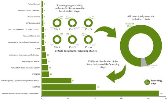 During this phase, each study underwent a binary evaluation, where the title and abstract were reviewed to assess whether they met all predefined inclusion criteria. After screening the 641 identified items, 611 (95.3%) met all the refined inclusion criteria. These items, relevant to the research focus, were filtered based on factors such as publication date, type, language, access, and relevance. The distribution of the approved items, as shown in Figure 2, reveals the dominance of seven key publishers. IEEE leads with 264 items (43.2%), highlighting its authority in technological research, especially in areas like microgrids and energy management. Elsevier follows with 122 items (20%), contributing significantly to energy management and optimization strategies. MDPI provided 67 items (11%), reflecting its influence on renewable energy integration and control strategies. Springer contributed 17 items (2.8%), focusing on optimization and control for microgrids. Pergamon-Elsevier Science Ltd. added 15 items (2.5%), aligned with Elsevier’s broader scope. John Wiley and Sons Inc. contributed 12 items (2%), known for work in optimization in energy systems, while the Institution of Engineering and Technology (IET) provided 10 items (1.6%), focusing on innovative solutions in energy management.