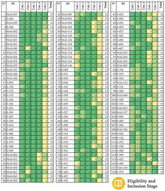 At this stage of the systematic review, a full-text evaluation of the selected items is conducted to ensure that the studies meet a higher standard of relevance and quality. The objective of this phase is to ensure that only the most pertinent and high-quality works are included in the final synthesis. For this purpose, five eligibility criteria have been defined, each assessed on a three-level scale: