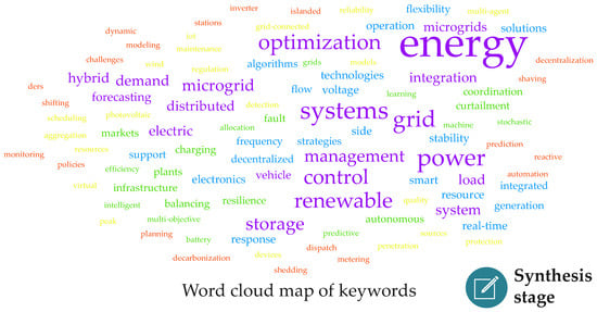 Using the keywords from the selected works, a word cloud map has been constructed to identify the most prevalent terms for the synthesis phase (Figure 5). This visualization highlights key concepts such as Integrated Energy Storage, Electric Vehicle Systems, Microgrids, Algorithms, Control Strategies, Energy Optimization, Renewable Energy Integration, Grid, and Demand Response Systems. By examining these predominant terms, the word cloud assists in determining the central focus areas for further analysis and provides insight into recurring themes, which will guide the synthesis of the research findings.