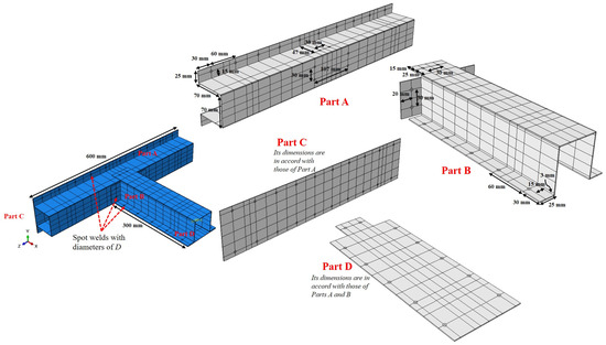 A three-dimensional XFEM model is created in this study to analyze how the spot-welded assembly responds to cyclic bending loads. The Abaqus 2021 FE software [17] was employed for constructing the model. The geometric characteristics of the assembly’s constituent parts are illustrated in Figure 1, comprising four primary sections. Throughout the fatigue loading process, Parts A and B, serving as the primary components, receive support from Parts C and D, respectively.