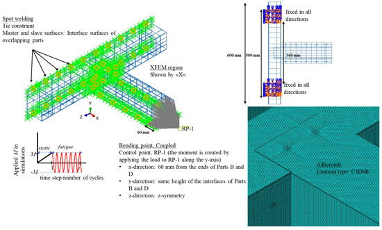 Figure 2 displays the specifics of the developed XFEM model. The assembly was exposed to bending moment M applied from the free ends of Parts B and D, each with a length of 40 mm. Meanwhile, Parts A and C were fixed in all directions in regions with lengths of 70 mm close their respective free ends. M was applied to the reference point (RP-1) depicted in Figure 2, positioned at the geometric center in the y- and z- directions and 60 mm in the x-direction from the loaded portion of the structure. RP-1 controlled the relevant region using a coupling constraint defined in the model. XFEM was primarily applied to the areas of the parts connected via spot welds, aligning with findings in the existing literature indicating that cracks primarily originate and propagate around spot welds in the structure. Utilizing Abaqus’ tie constraint module, the part interfaces on the welding side were labeled as master and slave surfaces to mimic spot welding. A total of 38 spot welds were utilized to combine the various parts to make the assembly: 20 welds joined Parts A and C, 10 welds joined Parts B and D, 6 spot welds united Parts A and B, and 2 spot welds fused Parts A and D together.